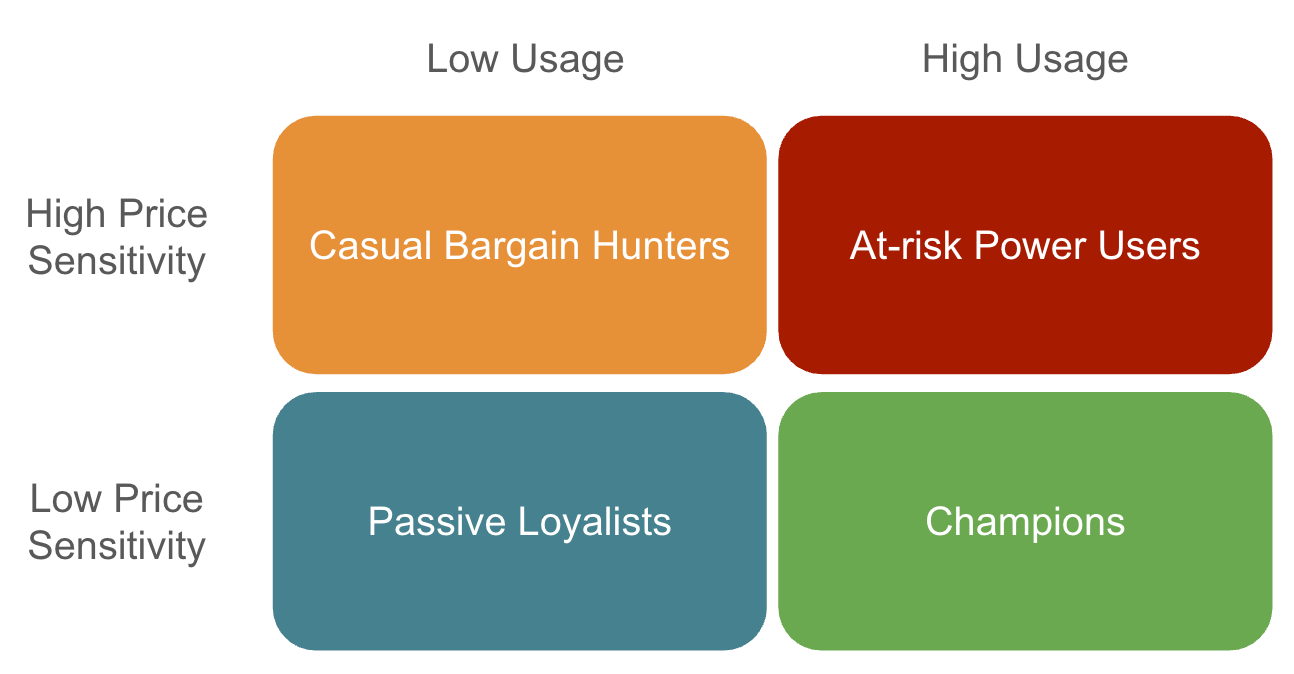 Use a simple 2x2 where each quadrant represents a distinct customer type based on how much they use your product and how sensitive they are to price: