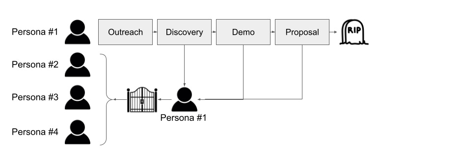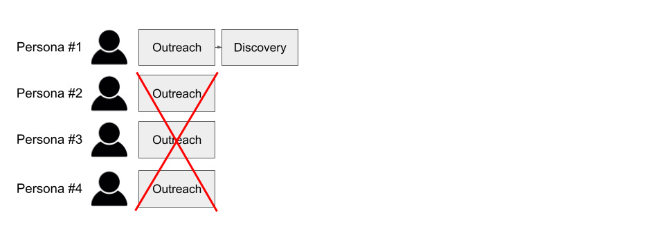 Having stopped the outreach sequence, they rely on the initial persona to be their gateway to the remaining personas, effectively switching to a single-threaded sales process. However, instead of becoming a gateway, the initial persona becomes a gatekeeper: